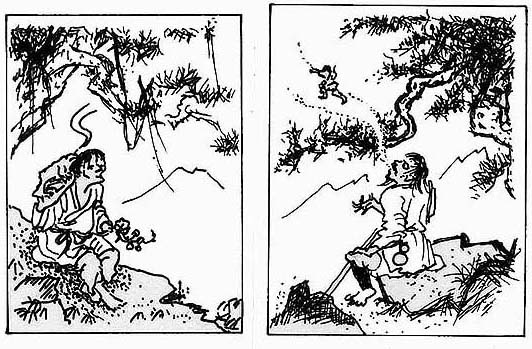 | Ch: Hama Tiegue. Two Taoist immortals frequently paired in Chinese and Japanese painting. Gama 蝦蟇 (Ch: Hama), also called Ryuu Kaizen 劉海蟾 (Ch: Liu Haichan) or Katsugen 葛玄 (Ch: Gexuan), is said to have been a high official in the state of Jin 金 who retired to Nanshan 南山 to learn Taoist magic. Gama, whose name literally means toad, is easily identifiable by the large, three-legged toad which perches on his shoulder. He is also distinguishable by his long, tangled hair, bare feet, and completely hairless face covered with unsightly protuberances. A variety of accounts explain Gama's association with the toad. According to one story, the toad lived in a large swamp until Gama lured it out with gold coins strung from a stick. Gama is also said to have been able to fly while riding on the toad. Tekkai 鉄拐 (Ch: Tieguai), bore the family name Li 李 and was also called Kouzui 洪水 (Ch: Hongshui). According to the RESSEN ZENDEN 列仙全伝 (Ch: Liezian Quanzhuan), he was able to blow his soul from his body and thus travel great distances. On one such very long journey, his disciples, thinking him dead, burned his body. When he returned at last, Tekkai had to occupy the form of a lame beggar who had recently died. In painting he is seen in this form, with a rough hairy face, leaning on a crutch, and carrying a wine-gourd hung from his belt. Usually he is pictured blowing forth his soul which is personified as a small man, often a miniature beggar. The Yuan painter Yan Hui (Jp: Gan Ki 顔輝) is credited with creating the prototypical Gama and Tekkai images (Chionji 知恩寺, Kyoto) which greatly influenced Japanese painters such as Minchou 明兆 (1351-1431), an explanation be seen in Toufukuji 東福寺, Kyoto; Sekkyakushi 赤脚子 (act. mid-15c.) and members of the Kanou school *Kanouha 狩野派. Gama and Tekkai are also included among the grouping of eight immortals, and thus were parodied in *ukiyo-e 浮世絵 prints. | ||||||