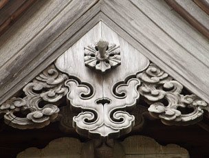 lit. hanging fish. 1 Decorative wooden board used to cover the ridge and purlin ends on a roof gable. It is believed that gegyo were originally carved in the shape of fish as a charm against fire, and were introduced to Japan from China. Illustrations suggest that gegyo existed in Japan as early as the 7c, but their exposed position on the gable end made them vulnerable to wind and rain damage, so no examples survive. The earliest extant gegyo date back to the the Kamakura period, and can best be seen on miniature shrines *zushi 厨子. Gegyo are often found on shrine, temple, or castle roofs, and occasionally on domestic architecture, for example the Imanishi 今西 house (1650) in Nara. They are usually secured with a wooden peg, or a hexagonal metal fitting called *rokuyou 六葉. Decorative extensions on the sides of gegyo are called fins *hire 鰭, and scroll-like decoration at the base is known as *warabite 蕨手. Gegyo are classified according to their position on the gable, or their shape. The *omogegyo 本懸魚 covers the ridge, and *kudarigegyo 降懸魚 or *ketakakushi 桁隠 cover lower purlins right and left of the ridge. The *unokedooshi 兎毛通 (rabbit's-hair cover) is found on the ridge of an undulating bargeboard *karahafu 唐破風. Various decorative shapes of gegyo include the boar's eye *inome gegyo 猪目懸魚, turnip *kaburagegyo 蕪懸魚, shell-head *kaigata gegyo 貝形懸魚, trefoil *mitsubana gegyo 三花懸魚, the straight-sided hexagonal *kirigegyo 切懸魚, and irregular hexagonal *umebachi gegyo 梅鉢懸魚. In the Edo period gable pendants known as choukoku gegyo 彫刻懸魚 were adorned with all kinds of high relief sculptures such as flowers, animals, birds and dragons. See also *karimata gegyo 雁股懸魚, *yuiwata gegyo 結綿懸魚. 2 A bargeboard pendant with a vertically set double design. It has a large motif of top and close duplication of the same design below it on a smaller scale. This type of pendant first appeared in the Edo period. |