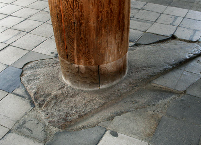 Lit. foundation stone. A base stone which receives the dead load of a pillar. The upper side of the base stone was made roughly level. Natural and processed stones both have a mortise *hozoana ほぞ穴 into which a tenon *hozo ほぞ, is inserted that extends from the bottom of the pillar. A tenon sometimes is cut into the base stone to be inserted into a corresponding mortise on the bottom of the pillar. Some base stones have an extension which serves as a sill or a ground plate, jifukuza 地覆座. During the 7-8c a porous limestone called tufa *gyoukaigan 凝灰岩, was used and the developed of stone progressed. From the latter part of the 8c after floored buildings became common, stone processing declined. Many natural base stones were cut from andesite, anzangan 安山岩, a type of volcanic rock and granite, kakougan 花崗岩. A firmly packed bed of golfball-sized stones underlay base stones in the ancient period. The use of natural stones for base stones was common until the premodern age when carefully cut stones were used.