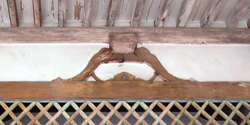 | Also called *kurinuki kaerumata 刳抜蟇股. A frog-leg strut that is scooped or gouged out. By the second half of the Heian period, frog-leg struts were gradually becoming more ornamental and less structural than the original solid board frog-leg struts *kaerumata 蟇股. Hence, an openwork type of frog-leg strut was created. The earliest struts were not really carved out of a solid panel but were carved in two pieces, one the reverse of the other. They were joined together to look like a single carving of genuine frog's legs or honkaerumata 本蟇股. During the Kamakura period, they were carved in one piece. A variety of designs abound but during the proto-modern period (16-19c), they became ornate and the delicacy of the early openwork-style of frog-leg struts was lost. | ||||||