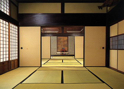 | A generic term for a room covered with straw mats *tatami ô. In the Heian period when aristocratic dwellings *shinden-zukuri Q“a‘¢, were floored with wooden planks, woven straw or rush mats, some with bound edging, and thick mats agedatami ãô that raised the person a little above floor level were used for seating. Eventually, from the late 12c, the word zashiki applied to rooms completely covered with straw mats and was used for guests. Thus, it became a reception room or guest room. This custom was later emulated in the folk dwellings *minka –¯‰Æ of lower ranking people in the Edo period. Both *sukiya ”Šñ‰® and *shoin ‘‰@, later came to use not only tatami but also incorporated alcoves (both *tokonoma °‚ÌŠÔ and *wakidana ˜e’I) in the zashiki. | ||||||