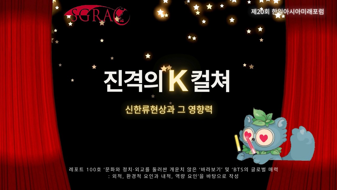 この動画は、2022年5月にオンラインで開催された「第20回日韓アジア未来フォーラム『進撃のKカルチャー:新韓流現象とその影響力』」の小針進先生の発表「文化と政治・外交をめぐるモヤモヤする『眺め』」と韓準先生の「BTSのグローバルな魅力」を中心にまとめたものです。このフォーラムのレポートは日本語と韓国語で発行されていますので、興味のある方は各言語のレポートをSGRAのウェブサイトからご覧ください。