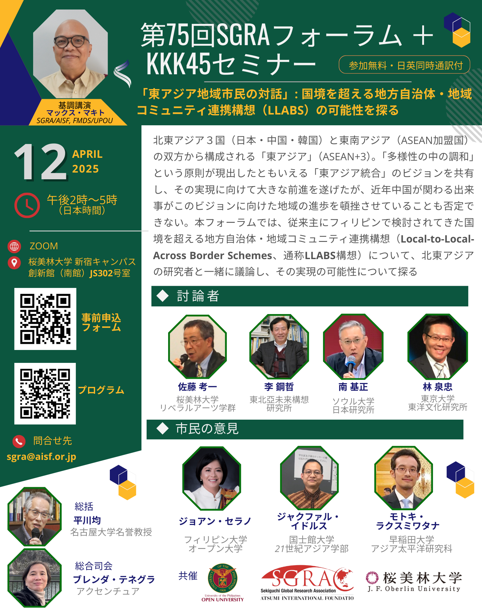 第75回SGRAフォーラム・第45回持続的な共有型成長セミナー 「東アジア地域市民の対話」へのお誘い