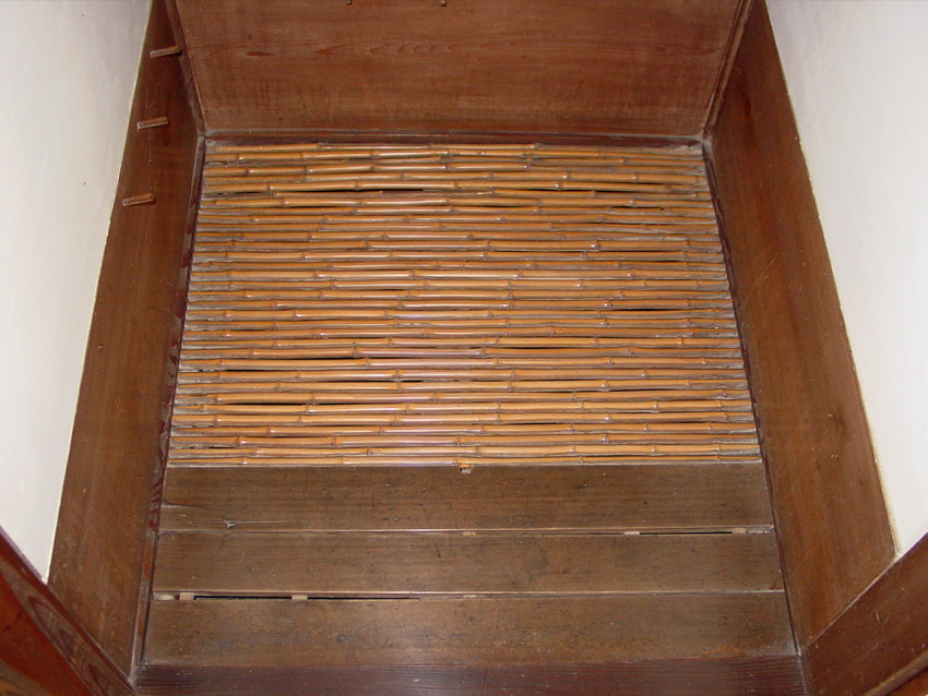 | A slatted floor or duckboard floor made of boards or bamboo laid parallel with space between, Each board is called sunoko-ita âÅŽq”Â. Sunoko have many uses. Sometimes it is used for a kitchen *mizuya …‰® sink in a tea ceremony house *chashitsu ’ƒŽº or on the floor of a bathroom yokushitsu —Žº. When used as a veranda with a slatted floor it is called sunokoen âÅŽq‰ or âʼn. During the Heian period exterior verandas were made of narrow boards with spaces in between to allow for the run-off of rain. The slats were often 12cm.sq. timbers or thick, widely spaced duckboards. Sometimes narrow boards alternate with whole bamboo with spaces in between to create veranda flooring. Duckboard verandas may also be made of closely laid bamboo entwined with wisteria vine. These elaborate arrangements were provided at the entrance of a nobleman's dwelling built in the sukiya style *sukiya-zukuri ”Šñ‰®‘¢, and beyond were the translucent sliding screens *shouji áŽq constructed in the shoin style *shoin-zukuri ‘‰@‘¢. Some folk dwellings *minka –¯‰Æ contain a room with bamboo laid close together but with a small space between them. Ceilings in folk dwellings are made with mats of small or split bamboo, ditch reed etc. and are called sunoko tenjou âÅŽq“Vˆä. These are coarsely woven and spread over the ceiling beams. Straw mats may be laid over them. An article in the TAMON-IN NIKKI ‘½•·‰@“ú‹L (dairy; 1586) records the oldest example found in the dwelling of Kon'ya Saijirou ®‰®Ë“ñ˜Y of in Nara. | ||||||