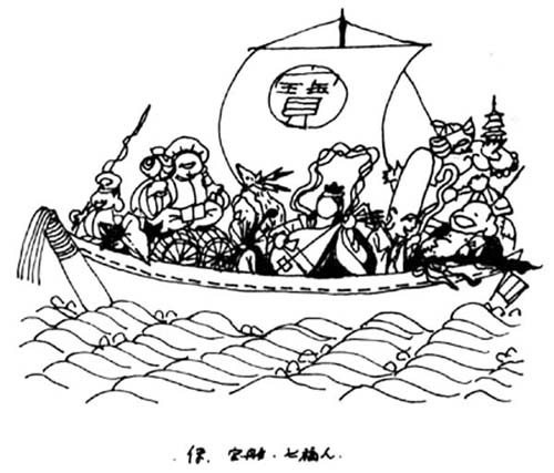 | A sailboat, hokakebune 帆掛船 at full sail, loaded with rice bushels and treasures takara 宝, often bearing the seven gods of good fortune *shichifukujin 七福神. Paintings or prints of this boat usually include a special and auspicious poem which reads the same when read backwards from the end; nagakiyo no/ tou no nemuri no/ mina mezame/ naminori fune no/ oto no yokikana 長き夜の/ 遠の眠りの/ 皆目覚め/ 波乗り船の/ 音のよきかな [Awakening from a deep sleep after a long night, I seem to hear the sweet sound of a boat sailing through the waves]. The Chinese character, baku 獏, a Chinese imaginary animal which is thought to devour (i.e. prevent) nightmares, is sometimes found written on the sail . Often auspicious cranes and tortoises are depicted in the sky and the sea. Although the origin of treasure-boat paintings is not clear, one Edo period record indicates that they were started in the Muromachi period. According to a different source, they were originally imperial gifts to high-ranking courtiers in celebration of the New Year. It became a popular custom among common people in the Edo period to place takarabune pictures under one's pillow on the second night of the New Year to induce auspicious dreams and resulting good fortune. In the event of a bad dream, one custom was to set the painting adrift in the river or sea to forestall bad luck. Simple, uncolored woodblock prints of the treasure-boats came to be sold on the streets by roving vendors from the early 18c until the mid-Meiji period. There are numerous examples of the treasure- boat done as inexpensive woodblock prints that still exist. However, there are also fine hanging scrolls painted usually in ink by first-rate artists of the Edo period, such as Ogata Kourin 尾形光琳 (1659-1716) and Tani Bunchou 谷文晁 (1763-1840). *Ukiyo-e 浮世絵 print artists also introduced variations such as *mitate-e 見立絵 of the seven gods of good fortune replaced by seven beauties or by popular *kabuki 歌舞伎 actors of the day. | ||||||