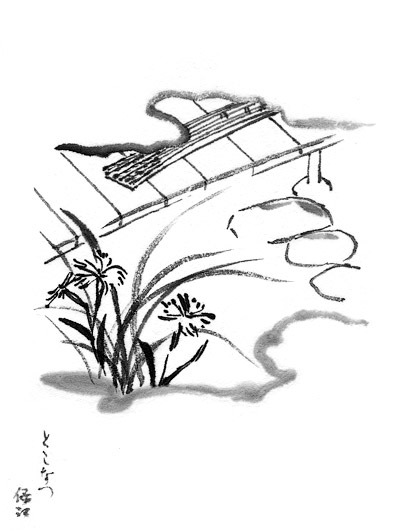 | Lit. everlasting summer. A pictorial subject taken from the "Wild Carnations", Chapter 26 of GENJI MONOGATARI Ή¨κ (The Tale of Genji). Tokonatsu is an old name for "nadeshiko" q (a late summer/autumn flower), often rendered as "wild pinks." This chapter concerns the problems arising from the introduction into the household of an illegitimate, long-lost daughter of Tou no Chuujou ͺ«, Genji's old friend and rival. The girl's country ways are unrelieved by the beauty and ability of *Tamakazura Κι‘, being in fact emphasized by comparison. Scenes chosen for illustration tend to focus on the more elegant sub-plots: Genji and other courtiers have a picnic in the fishing pavilion tsuridono ήa on a hot summer day and enjoy cooked trout or white fish, ayu Ό; or Genji teaching Tamakazura to play the koto Υ (Japanese zither) in autumn, when wild carnations bloom in the garden. | ||||||
